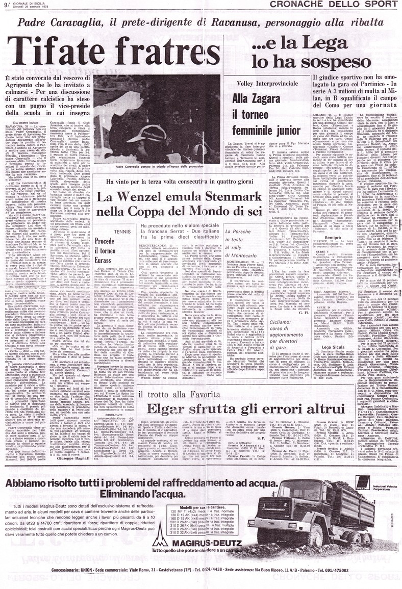 E Padre Caravaglia sale per la prima volta alla ribalta della cronaca nazionale. Due giorni dopo il professore Angelo Lauricella, fratello dell’onorevole, vice preside della scuola dove insegna Padre Caravaglia, si lamenta degli eccessivi sfottò dei rivali.